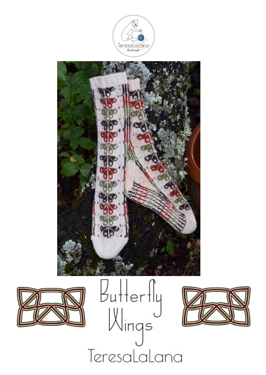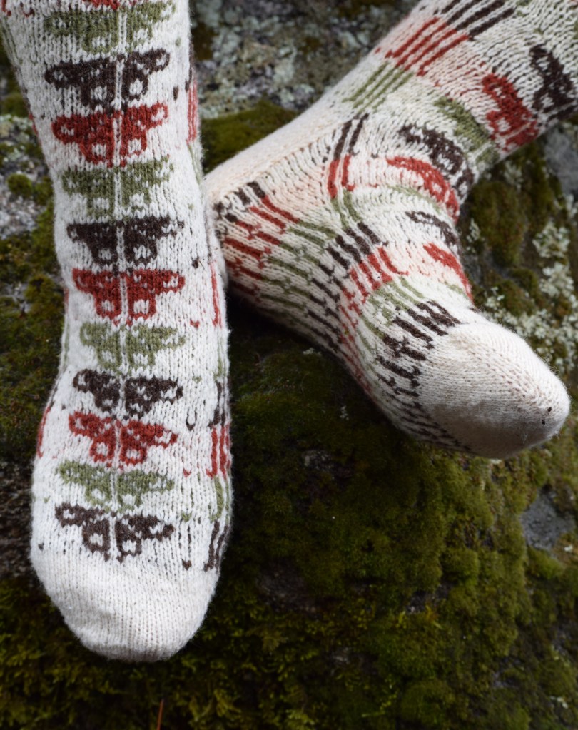 Knitted toe-up, with a heel flap & gusset construction, this socks feature an all-over stranded pattern inspired by the delicate wings of the butterflies that visit my garden each year.