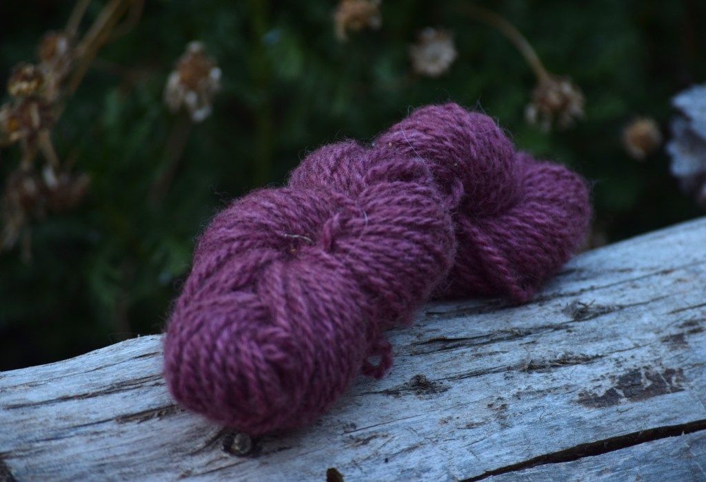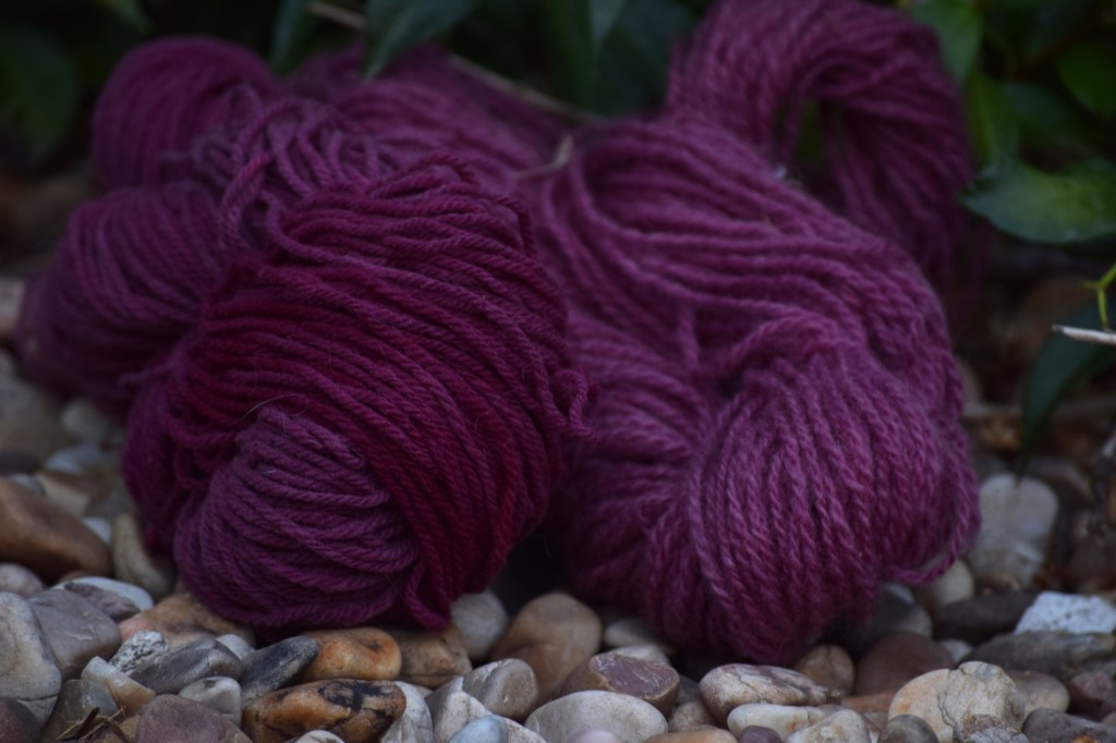 As I had some colour left in my dye bath I decided to add a small skein of 100% merino that came out as a light dust lilac!