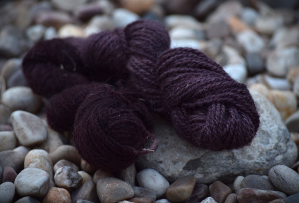 Like in previous experiments I dyed two skeins (one 100% merino and one 65% guirra) and …. What a beautiful result! A dark, dark aubergine! Again the 100% merino was a lighter and brighter shade.