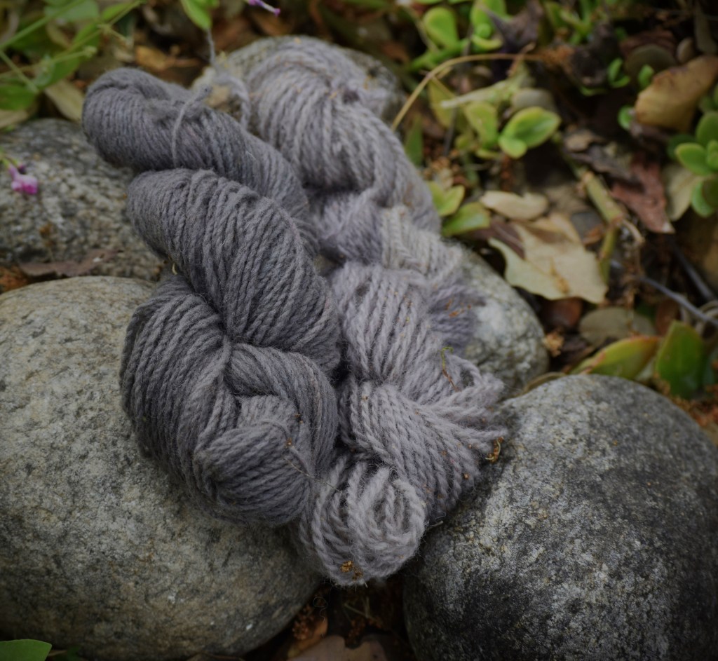 The final part of the experiment was the basic bath of ferrous sulphate, and did it disappoint me? Quite the opposite! I introduced both skeins (my usual 100% merino and 65% guirra), I waited to see the results until the dyebath cooled down overnight, took out the skeins and…. There they were! Two grey skeins with lilac undertones! Not surprisingly the 100% merino was a lighter and brighter shade, but both so beautiful!