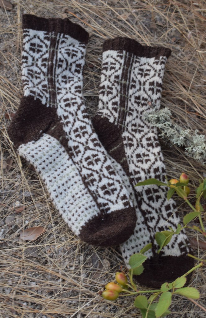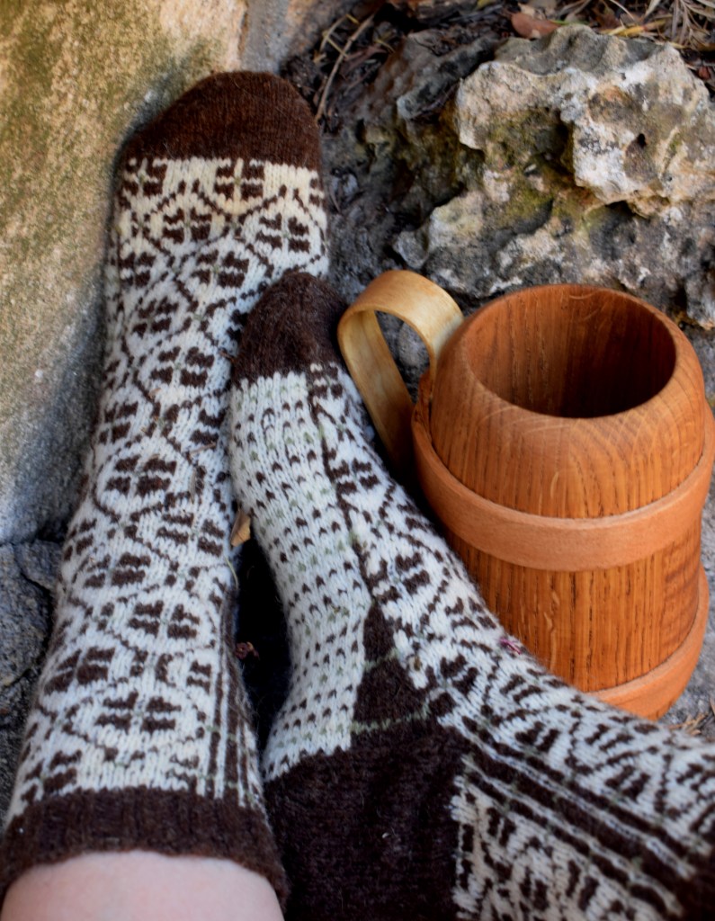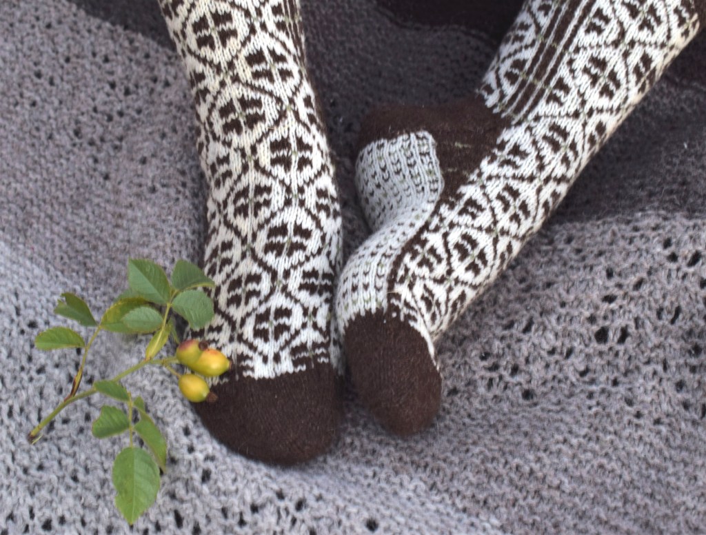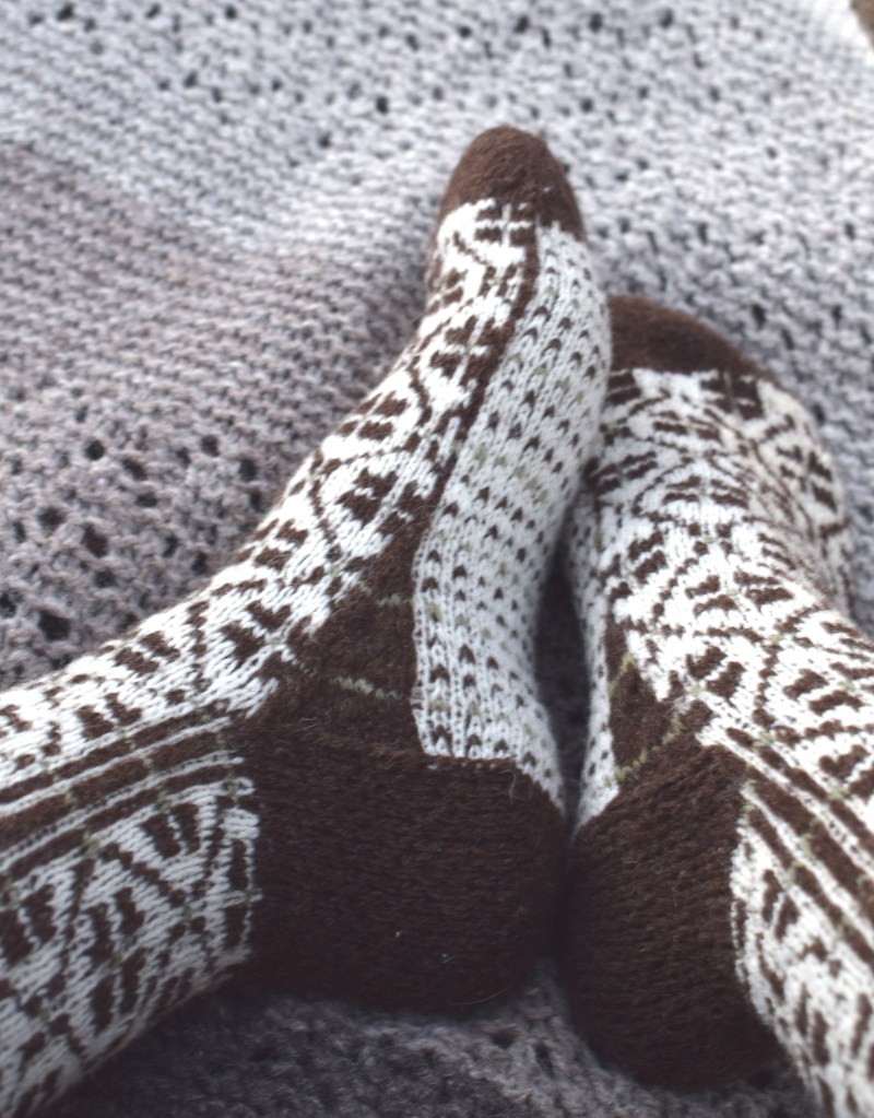 Knitted toe-up, with a heel flap & gusset construction, this socks feature an all-over stranded pattern inspired by the fictional character “Fidelma”, set on the Early Medieval Ireland.