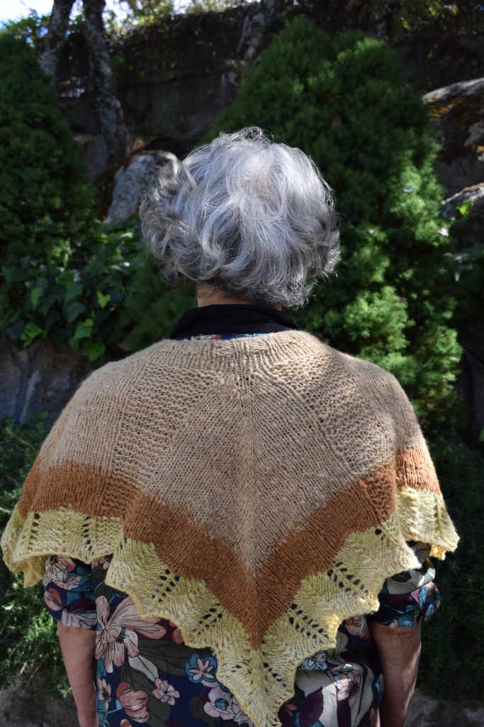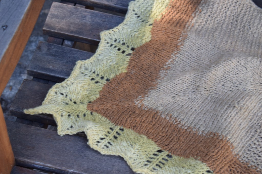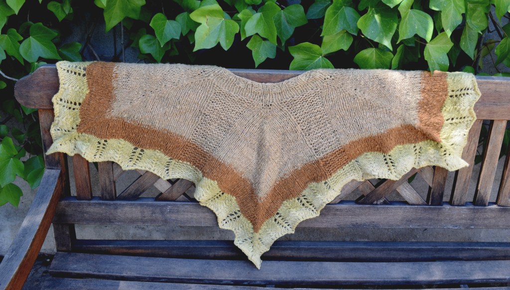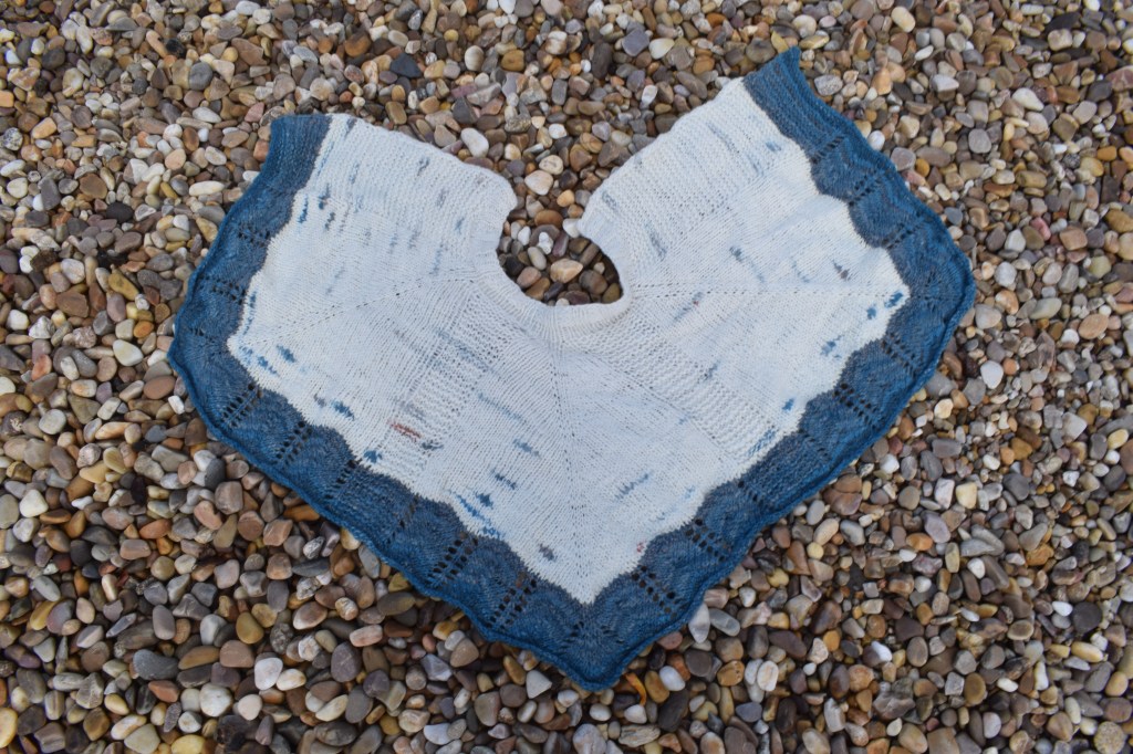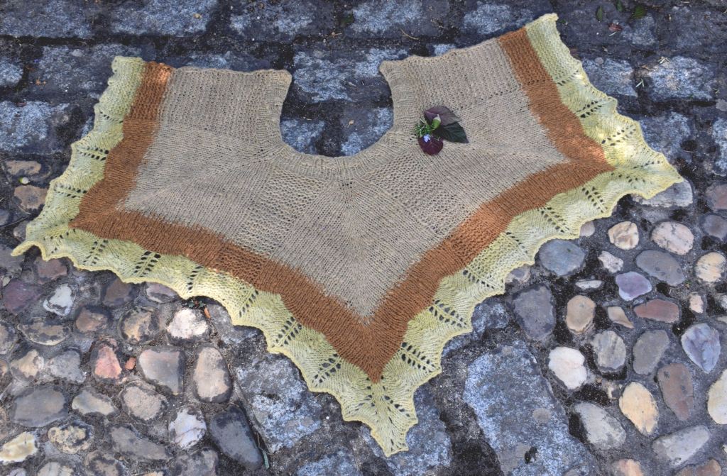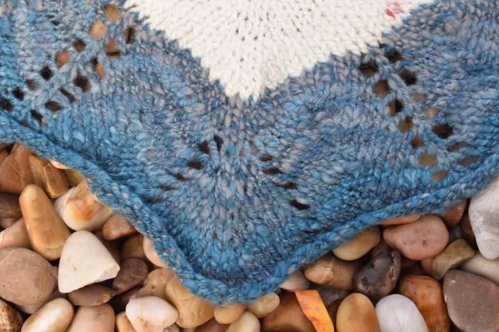 The shawl is simple to knit. It consists of the body (which is divided in 3 diamond-shaped areas of stockinette stitch & 4 areas of garter stich) & a beautiful border, that features the classic “Razor & Shell” pattern, adding a soft edge to the pereline