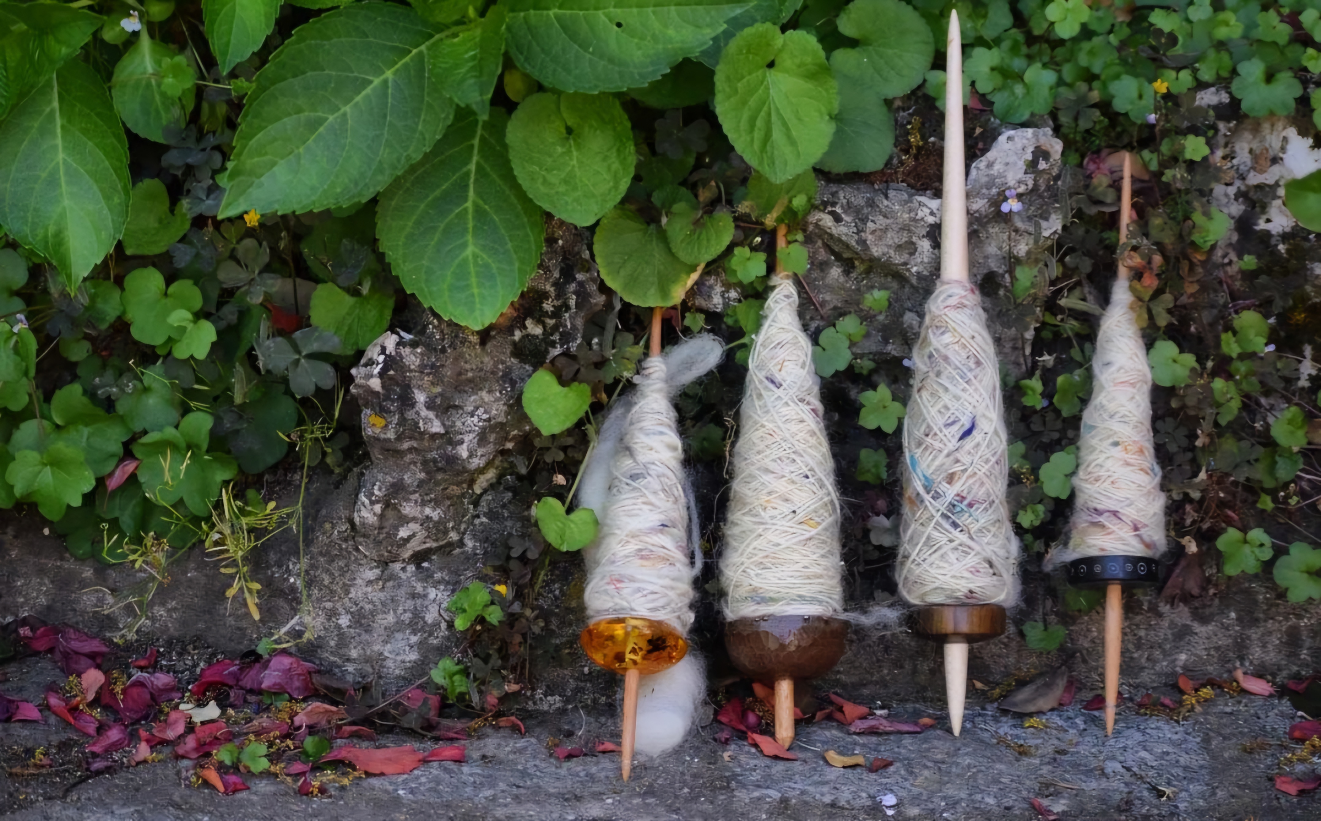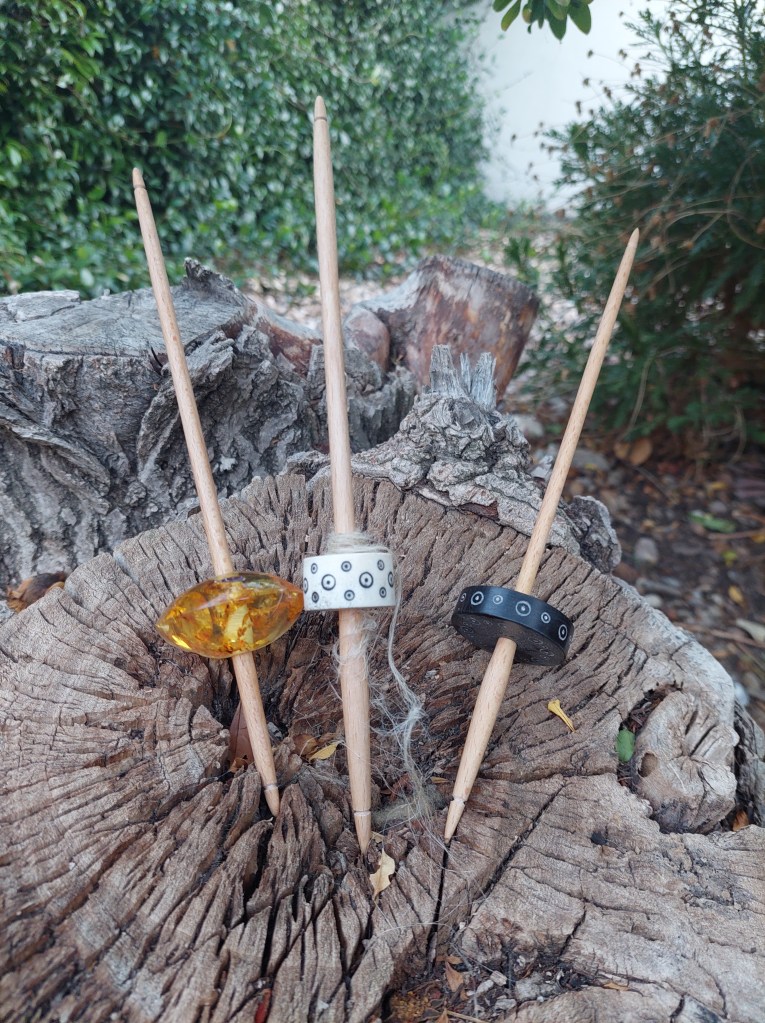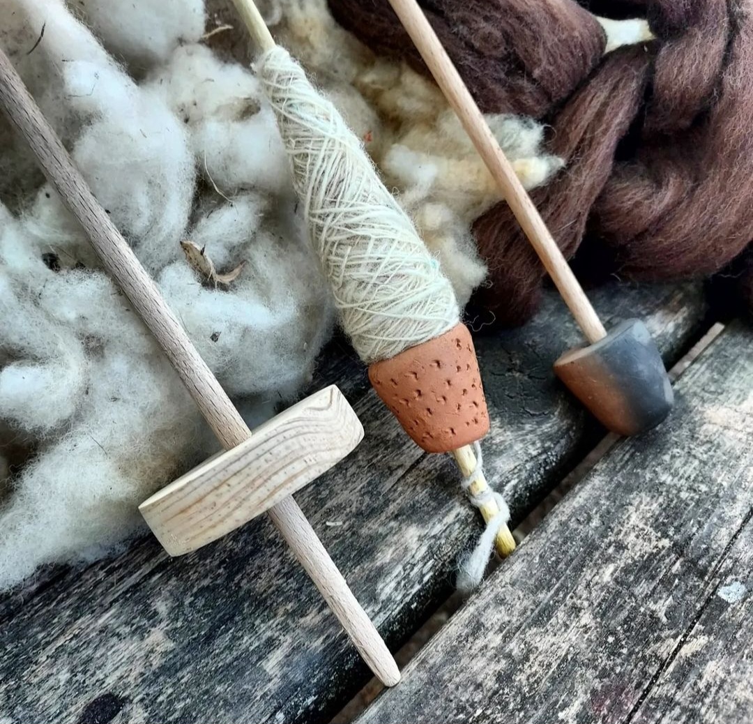 Although the basic anatomy of a drop spindle is very similar (a shaft, usually made of wood or metal & the whorl that gives weight to the spindle & can be made of many different materials, wood, bone, glass, metal, clay, stones, even amber…), there are many different subtypes of drop spindles. The form & where the whorl is placed on the shaft is what differentiate the different subtypes of drop spindles.
